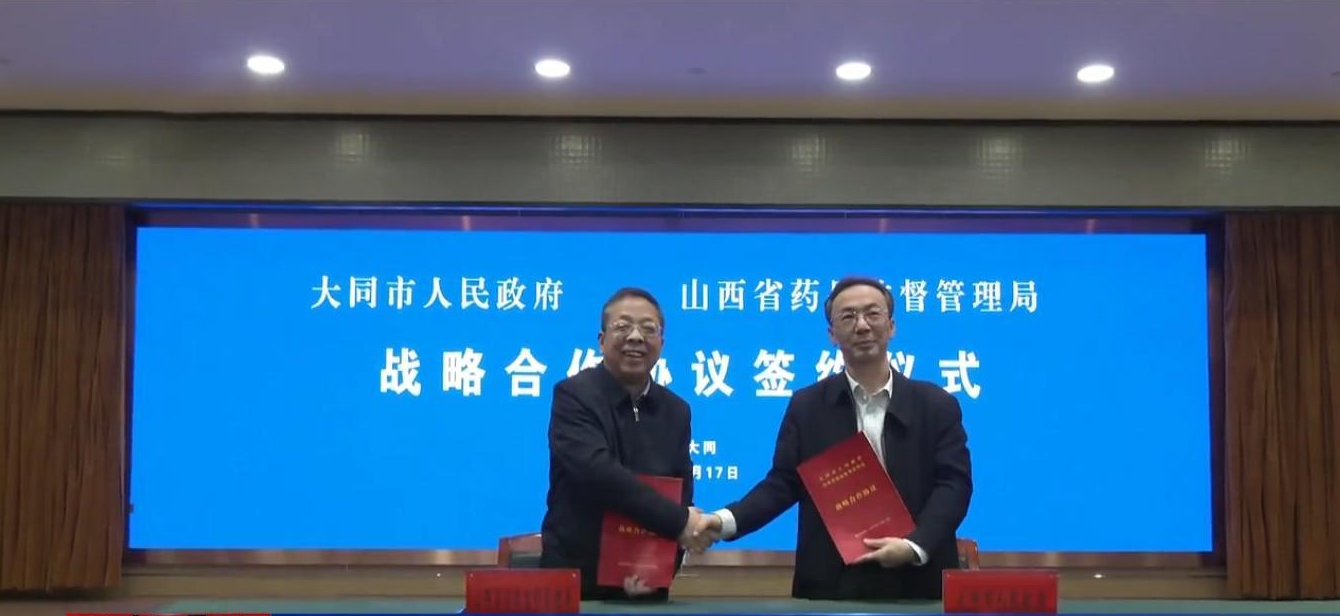 12月17日,山西省药品监督管理局与大同市人民政府举行战略合作签约仪式,省药监局党组书记、局长李庭芳,大同市委副书记、市长刘俊义出席并讲话。省药监局副局长王玉军、大同市副市长高新文分别代表双方签署战略合作协议。